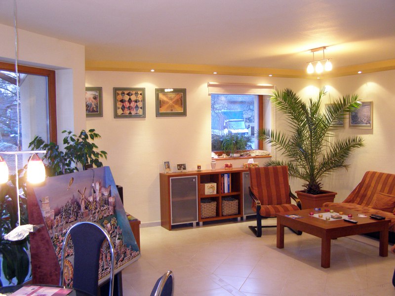 The building was completed and the owners moved into it in autumn 2005. They had to face an unusually cold winter in 2005/2006 which was very rich in snow. The heating system was given a tough test at the very beginning which proved that it can heat the individual rooms to the required temperatures without any problems. This forever closed the dispute over whether or not ceiling heating is capable of heating a house in harsh climatic conditions.
